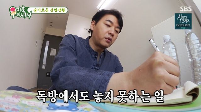 책상 위에는 앞사람들이 적어놓고 간 메모지와 펜이 있었다. 메모지에는 독방에 머물며 떠올린 단상, 명언들이 빼곡히 적혀 있었다. 그러나 하루아침에 생활 습관을 바꾸는 게 쉬운 일은 아니었다. ‘일+술 중독’ 김승수는 이달 동안 할 일을 메모지에 적으며 일정을 복귀했고, 김종국은 하체 스트레칭을 하며 시간을 보냈다. 김준호는 이불을 깔고 잠시 눈을 붙였다.