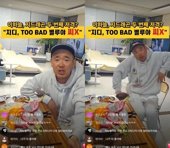 이하늘은 최근 자신의 유튜브 채널 라이브 방송 중 지드래곤의 신곡 '투 배드'(TOO BAD)에 대해 "나 솔직히 말할까? 나 'TOO BAD'도 별로야. 이번 노래 내가 봤을 때 춤도 별로고. 챌린지도 모르겠다"고 말했다.
