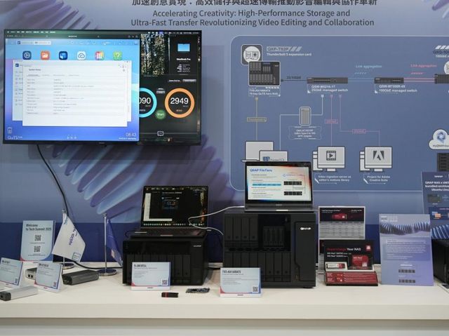 미디어·엔터테인먼트(M&E) 코너에서는 USB4 및 썬더볼트 5를 지원하는 100 GbE NAS가 주목받았다. 8K RAW 편집 파일을 실시간으로 주고받을 수 있을 만큼 대역폭을 확보했고, QNAP의 하이브리드 클라우드 게이트웨이로 프로젝트 데이터를 자동 계층화한다.