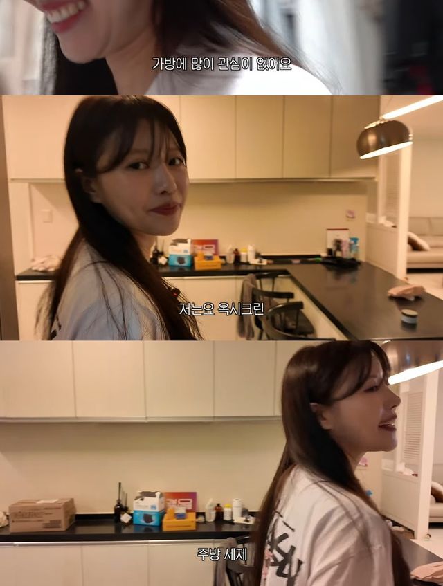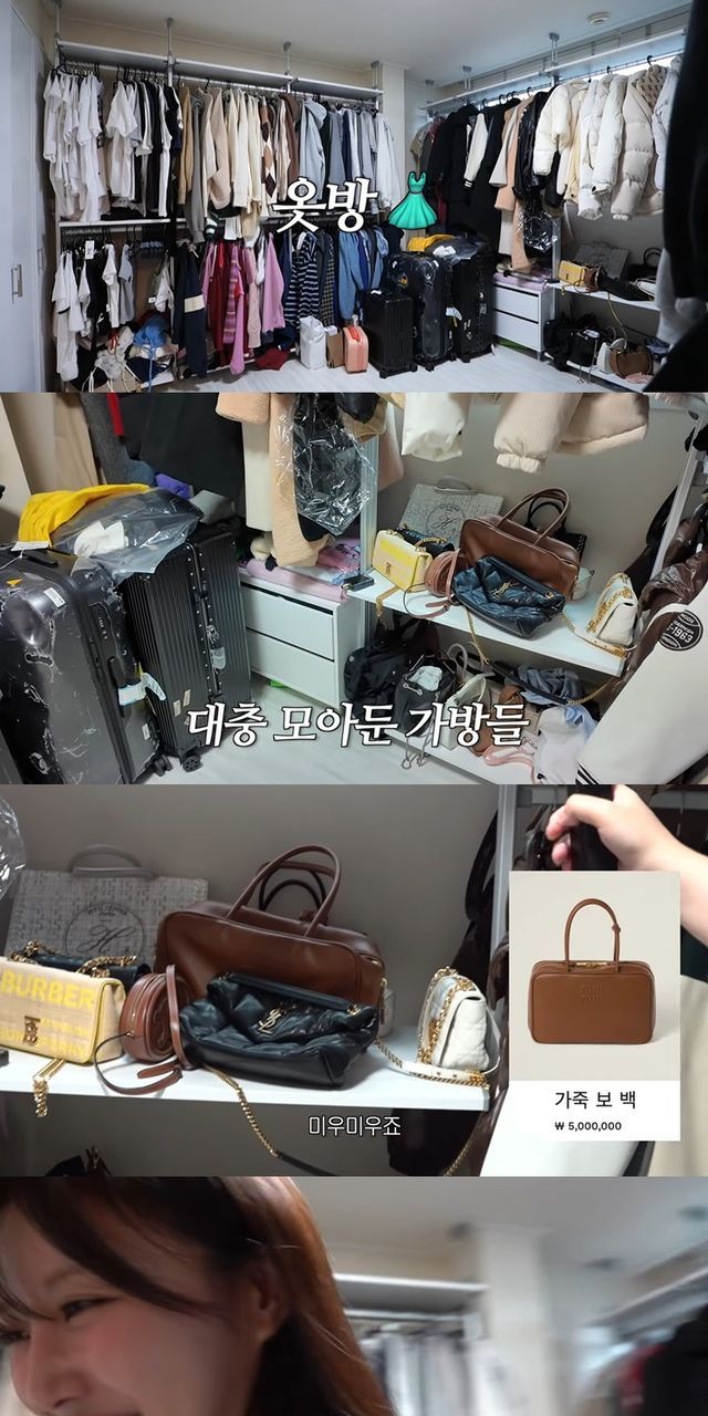이어 드레스룸도 소개했다. 색깔별로 정리된 옷들과 깔끔한 구조가 눈에 띄었고, 한쪽에는 가방을 모아둔 공간도 있었다. 그 중에는 미우미우, 버버리 등 명품 브랜드 가방도 있었지만, 다소 구겨진 채로 놓여 있었다.