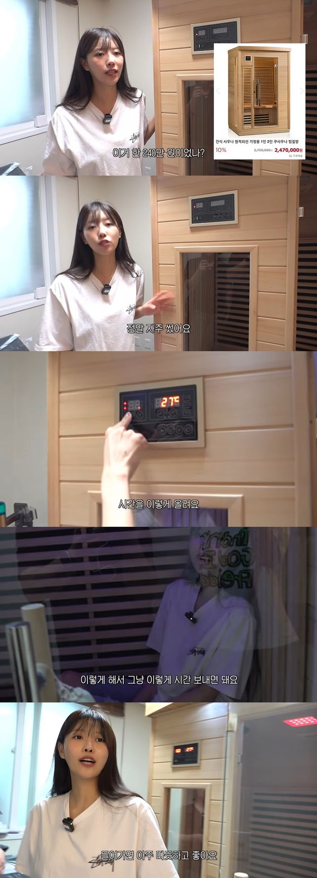 또 집 한편에는 240만 원에 구매한 가정용 사우나도 있었다. 자주 사용하느냐는 질문에 그는 "겨울엔 정말 자주 썼었다"고 답했다. 직접 사우나 안에 들어가 의자에 편하게 앉은 이미주는 "이렇게 시간 보내면 된다"며 "들어가면 아주 따뜻하고 좋다"고 만족감을 드러냈다.