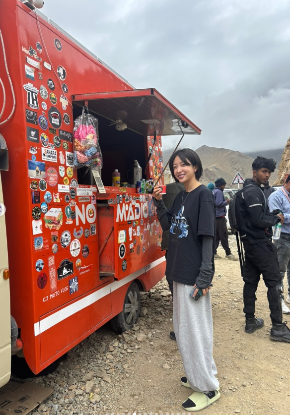 사진 속 하니는 운동화도 아닌 슬리퍼에 편안한 트레이닝복 차림으로 황량하고 거대한 산악지형 위에 서 있다. 머리 위로 구름이 휘몰아치는 하늘, 발아래 펼쳐진 암갈색 대지, 아찔한 산악 도로, 그리고 스티커가 가득 붙은 푸드트럭 앞의 하니. 모든 장면은 여느 여행과는 결이 다른, 라다크 특유의 분위기를 그대로 담고 있다.