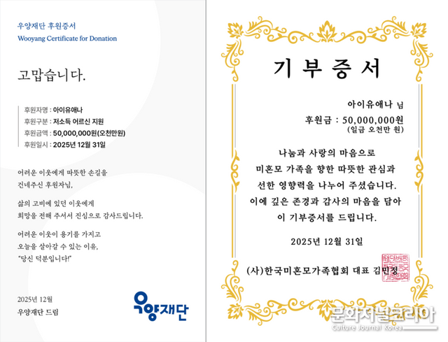 이번 기부금은 미혼모·자립 준비 청년·장애인·노인 등 다양한 취약 계층 지원에 사용될 예정이다. 기부금은 ‘한국미혼모가족협회’, ‘아동권리보장원’, ‘사랑의달팽이’, ‘우양재단’에 각각 5천만 원씩 전달 됐다.