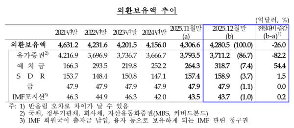 6일 한국은행이 발표한 '2025년 12월말 외환보유액'에 따르면, 지난달 말 우리나라의 외환보유액은 4280억 5000만 달러로 집계됐다. 이는 전월 말(4306억 6000만 달러)보다 26억 달러 감소한 규모다.