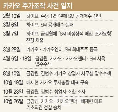이례적으로 특사경 조사에 대해 공식 자료까지 낸 금감원은 이번 주가조작 의혹에 대해 “조직적으로 가담한 사건으로, 자본시장의 근간을 해치는 중대한 범죄”라고 강조했다. 26일 카카오 주가는 전 거래일보다 1300원(3.34%) 떨어진 3만7650원에 마감했다. 2020년 5월4일(3만7434원) 이후 3년5개월여 만에 최저치다.