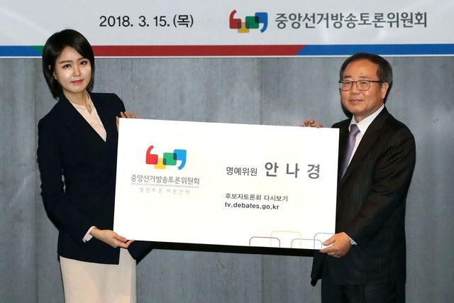 최은수 중앙선거방송토론위원회 위원장이 2018년 3월 15일 서울 중구 더플라자호텔에서 열린 제7회 전국동시지방선거 시·도 토론위원회 위원장회의에서 명예위원으로 위촉된 안나경 JTBC아나운서에게 위촉장을 전달하고 있다. / 뉴스1
