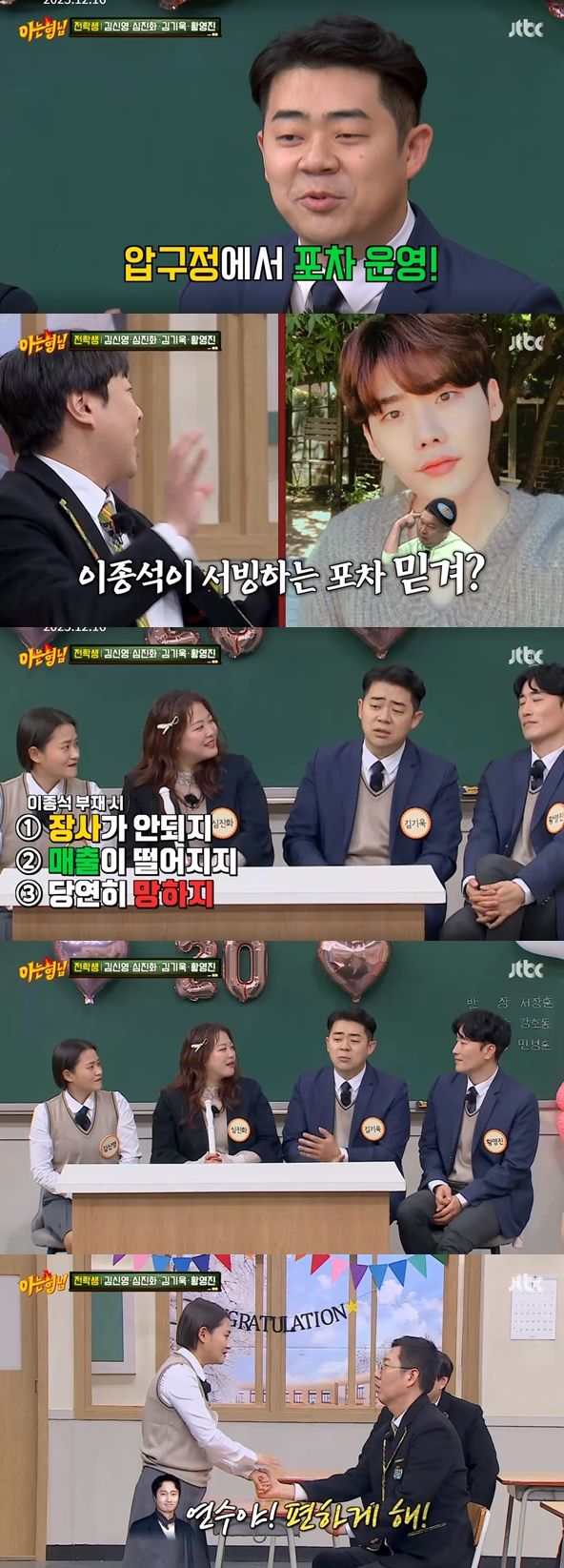 김기욱은 "굉장히 잘생긴 친구가 있었다. 그 친구가 바로 배우 이종석이다"라고 이야기했다. 그러면서 "3~4개월을 함께 했다. 사람이 진짜 많았다. 줄을 서서 들어갈 정도였다. 그런데 돌연 그만뒀다. 그 이후 장사가 안되고 매출이 떨어져서 폐업했다"고 밝혔다.