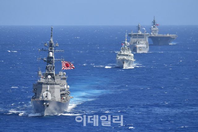 일본 해상자위대 함정들이 ‘욱일승천기’를 게양하고 기동훈련을 하고 있다. (출처=일본 해상자위대 SNS)