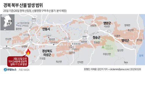 26일 산림 당국에 따르면 22일 의성에서 발생한 산불은 24일 안동 길안면, 남선면, 임하면 일부 마을까지 확산했고, 25일에는 동진하면서 청송까지 확산됐다.