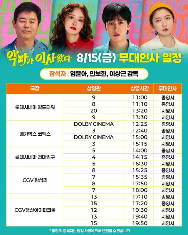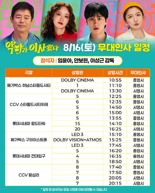먼저 개봉일인 8월 13일에는 임윤아, 안보현, 주현영 그리고 이상근 감독이 CGV용산아이파크몰과 메가박스 코엑스, 롯데시네마 월드타워를 방문해 극장에 찾아온 관객들에게 직접 감사 인사를 전할 것이다. 이어 개봉주 금요일인 15일부터는 임윤아, 안보현, 이상근 감독이 롯데시네마 월드타워를 시작으로 메가박스 코엑스, 롯데시네마 건대입구, CGV왕십리, CGV용산아이파크몰까지 방문해 무대인사를 진행한다. 개봉주 주말인 16일은 메가박스 하남스타필드시티, CGV스타필드시티위례, 롯데시네마 월드타워, 메가박스 구의이스트폴, 롯데시네마 건대입구, CGV왕십리를 순차 방문 예정이며, 17일은 롯데시네마 김포공항, 메가박스 목동, CGV영등포, 롯데시네마 영등포, CGV용산아이파크몰을 순차 방문해 영화 ‘악마가 이사왔다’를 선택한 관객들에게 진심 가득한 팬서비스를 보여줄 것이다.
