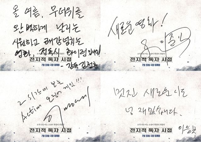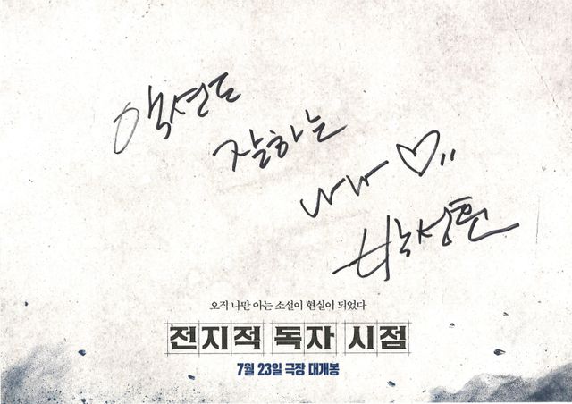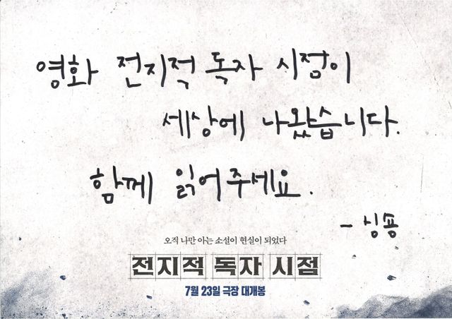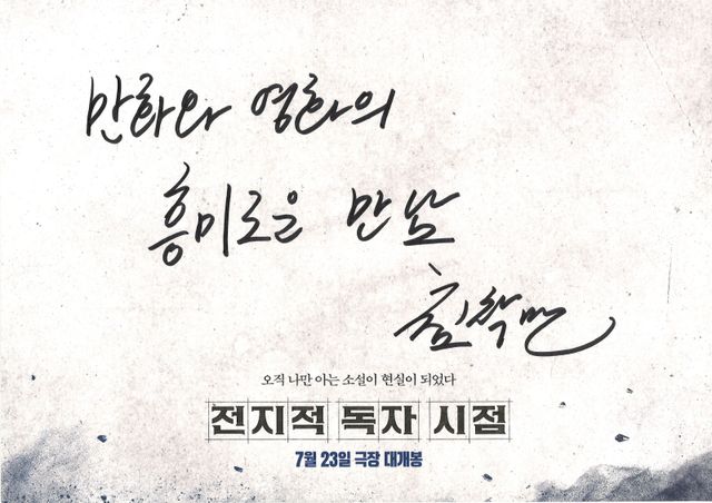 23일 배급사 롯데엔터테인먼트는 ‘전지적 독자 시점’을 향한 대한민국 대표 감독과 셀러브리티들의 친필 감상평을 공개했다. 동명 웹소설이 원작인 이 작품은 10년 이상 연재된 소설이 완결된 날 소설 속 세계가 현실이 되어 버리고, 유일한 독자였던 ‘김독자’가 소설의 주인공 ‘유중혁’ 그리고 동료들과 함께 멸망한 세계에서 살아남기 위한 판타지 액션 영화다.