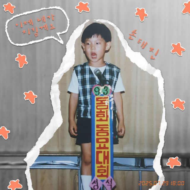 사진 속 어린 시절의 손태진은 ‘동요 대회’에 참여한 듯 무대 위에서 노래하고 있다. 반짝이는 눈망울과 순수한 표정, 작고 귀여운 체구가 어우러져 유년 시절의 따뜻한 감성을 자아낸다. 여기에 “이제 내가 지킬게요”라는 손글씨 말풍선과 아기자기한 그래픽 요소는 정겨운 ‘효(孝)’의 메시지를 친근하게 담았다.