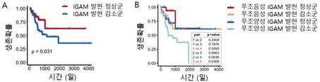 [그림 (A) IgA 성숙과 관련이 있는 유전자 모듈(IGAM)의 발현이 감소한 군에서 환자의 예후가 좋지 않은 것을 확인했다. (B) 특히, 푸조박테리아 양성 대장암에서 IGAM의 발현이 감소한 군에서 예후가 가장 좋지 않은 것으로 나타났다.]