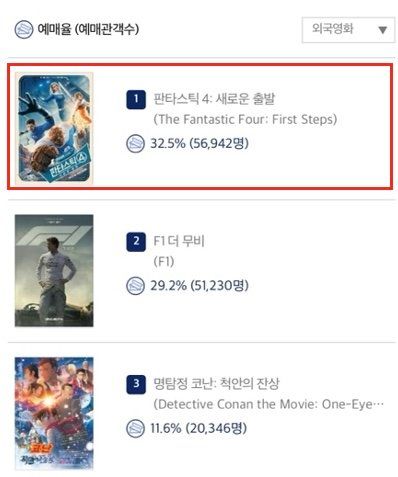 24일 개봉한 ‘판타스틱 4: 새로운 출발’은 영화관입장권 통합전산망 기준 72,690명의 관객을 동원하며 외화 박스오피스 1위를 차지했다. 이어 25일 오전 7시 기준 실시간 예매율에서도 외화 부문 1위, CGV 예매율 1위를 기록하며 압도적인 흥행 기세를 이어가고 있다. CGV 골든에그지수는 91%를 기록, 관객 만족도 또한 높은 수준을 유지 중이다.