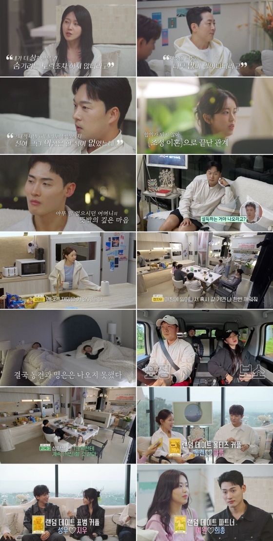 다음으로 아름은“순탄한 결혼 생활을 이어가던 중 전 남편에게 신뢰를 잃을 만한 일이 생겼고,그 생각이 머리에서 떠나질 않아 이혼하게 됐다”라고 덤덤히 얘기했다.도형은“결혼 직후 해외로 나가게 돼 단둘이 신혼살림을 시작했는데,여러 문제로 많이 싸웠다.그런데 기댈 데가 서로밖에 없다 보니,그게 함정이 됐다”라며 해외살이에 팬데믹까지 덮쳐 힘들었던 시절을 떠올렸다.명은은“결혼 후 어떤 일이 생기면서 그로 인해 매일 같이 싸웠다. (전 남편과)관계 유지를 위해 할 수 있는 걸 다 해봤지만,건강이 급격히 안 좋아져서 양가 부모님께 말씀드리고 이혼을 결정했다”라고 눈물을 글썽였다.무거운 분위기 속,인형은“결혼할 때 양가 경제 규모가 좀 차이가 났다.저희 부모님께서 여러모로 지원을 많이 해주셨다.그러던 중,직장 때문에 주말 부부가 됐는데,어느 날 평소보다 빨리 집에 가니까 아내가 반기질 않고 짜증을 내는 거다.거기에 남자 인기척까지 느껴졌다”라고 해 모두를 충격에 빠트렸다.동건 역시“전 아내가 유부녀란 사실을 숨긴 채 다른 남자들과 연락하고 지내는 걸 알게 돼 신뢰를 잃었다”라며 결혼식도 올리기 전 이혼해야 했던 사연을 전했다.