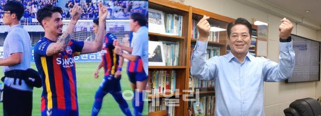 [안양=이데일리 황영민 기자] 1승, 1패. 한 번씩 주고받았다. FC안양 대 수원FC, 수원FC 대 FC안양. 이른바 ‘1호선 더비’ 양 구단주인 최대호 안양시장과 이재준 수원시장 간 ‘굴욕샷’ 대결 전적이다.