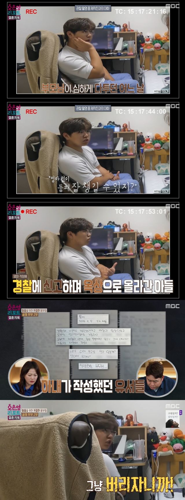 아들은 "'엄마가 울면서 엄마 없이도 동생 잘 챙겨 엄마가 못돼서 미안해'하고 다음에 얘기를 들어보니까 아빠가 때려서 멍든 거를 보여줬다"라고 밝혔다. 유서까지 남기며 여러 차례 극단적인 생각을 했던 아내.