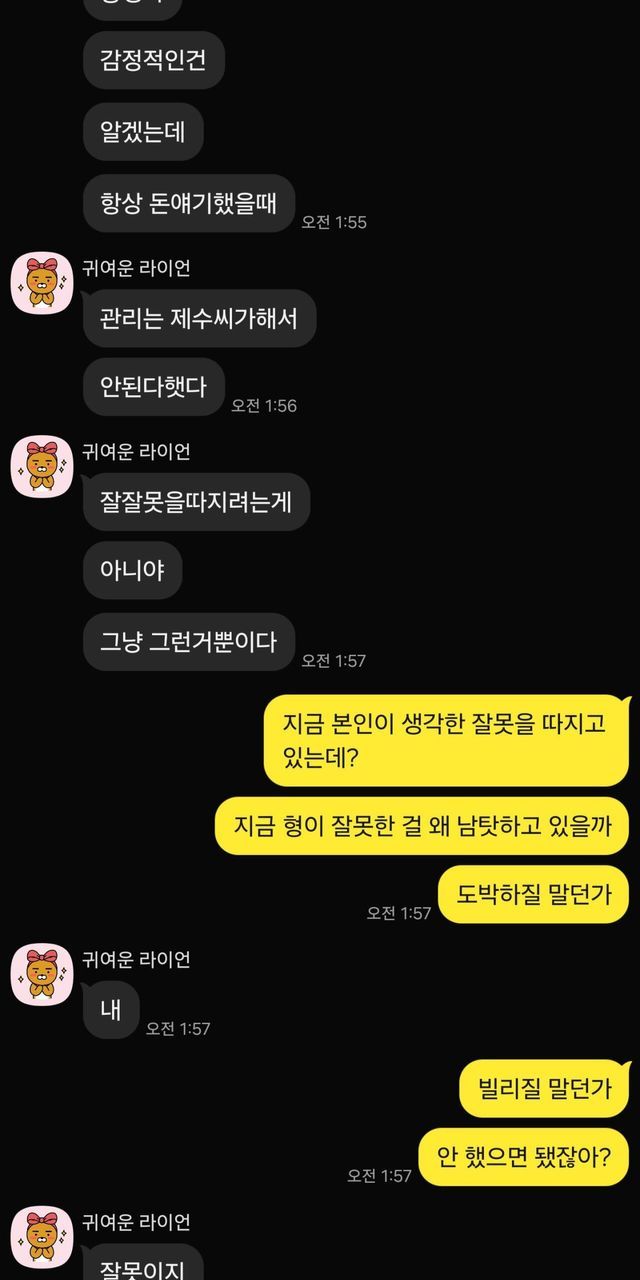 그리고 이런 일이 수도없이 많았는데 그 때마다 빚 있는 거 다 말하라고 다 갚아준다고 새인생 시작하라고 늘 부모님께서 말씀하셨는데 그 순간을 회피하고 싶어서 빚의 일부만 말하고 숨겨 일을 키운건 본인임에도 남탓하는 카톡에서 구역질 나오더라구요
