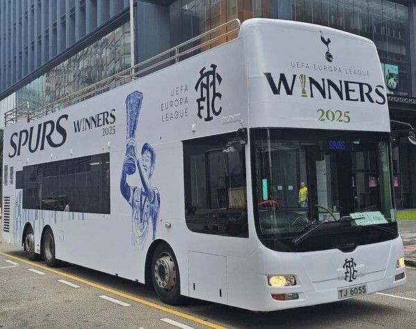 지난 시즌 토트넘의 유럽축구연맹(UEFA) 유로파리그(UEL) 우승을 축하하는 버스로, 트로피를 들고 환히 웃는 손흥민이 크게 래핑돼 있었다.