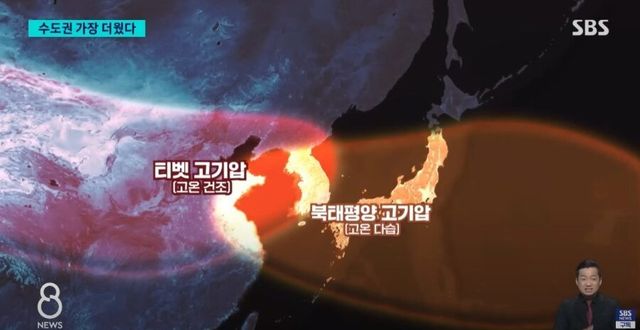 고온의 두 기압이 한반도에서 만나서 열돔을 형성.