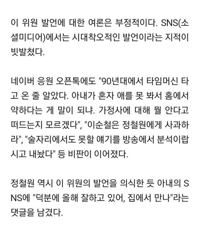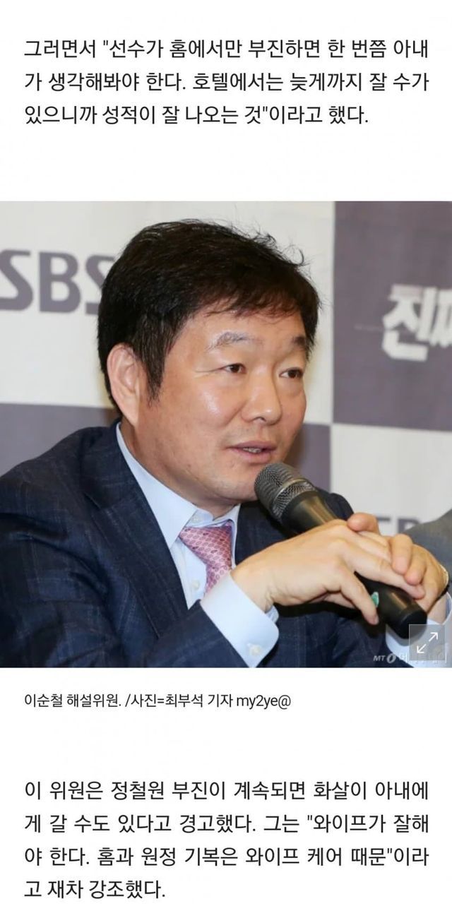 순페 : 그러면 집사람이 케어 잘해줘야함 야구선수들 원정 나가면 늦게까지 경기하니까 늦게까지 잔단말이에요 애가 어리면 일찍 깨서 정철원 선수의 믿음을 할 수 있단말이에요(??) 그러면 와이프가 케어를 잘못하면 홈에 들어와서 성적 나빠질 수 밖에 없음