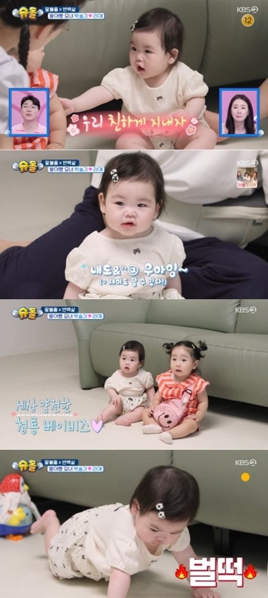 이날 방송에서 박수홍의 딸 재이는 2024년생 동갑내기 친구인 박슬기의 딸 리예를 만나 새로운 세계를 경험했다. 손을 흔들며 친구를 환영한 재이는 리예에게 먼저 다가가며 관심을 보였다. 특히 좋아하는 꼬꼬 장난감까지 리예와 함께 공유한 재이는 방긋방긋 요정미소를 지었고 옹알이를 터트려 귀여움을 자아냈다.