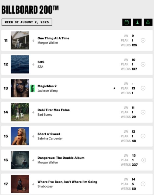지난 29일 미국 음악 전문 매체 빌보드가 발표한 최신 차트(8월 2일 자)에 따르면, 잭슨이 지난 18일 발매한 정규 2집 ‘매직 맨 2’가 메인 앨범 차트 ‘빌보드 200’에 13위로 진입하며 자신의 커리어 최고 순위를 기록해 글로벌 위상을 입증했다.
