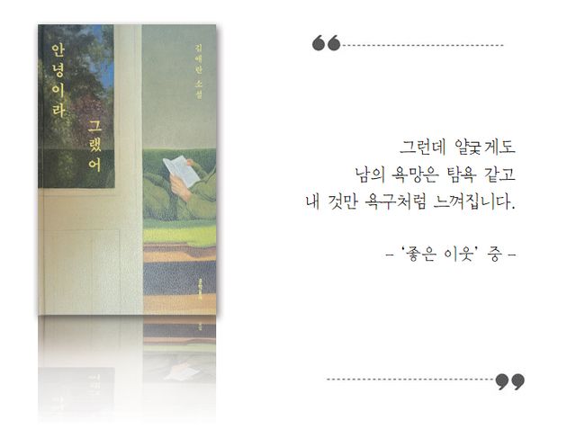 "이제 나는 헌수도 없고, 엄마도 없고, '다음 단계'를 꿈꾸던 젊은 나도 없는 이 방에서 '너한테 배웠어, 정말 많이, 정말 많이 배웠어'란 가사의 노래를 듣는다. 보다 정확히는 네가 아니라 너의 부재로부터 무언가 배웠다고."('안녕이라 그랬어' 중에서)