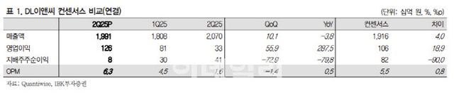 DL이앤씨의 2분기 매출액은 2조원으로 전년 동기 대비 3.8% 감소했지만, 영업이익은 1262억원으로 같은 기간 287.5% 급증하며 시장 컨센서스(1061억원)를 18.9% 상회했다.