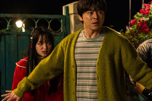 먼저 차 안에서 아빠 정환(조정석 분)을 향해 입질하는 수아의 모습은 좀비 본능이 깨어나는 긴박한 순간을 포착하며 묘한 긴장감을 자아낸다. 좀비 바이러스를 피해 고향 은봉리로 내려온 부녀는 할머니 밤순(이정은 분)의 집에 몸을 피하지만, 그곳에서도 딸을 지키려는 정환과 주변을 경계하는 수아의 위태로운 일상을 엿볼 수 있다. 반면, 밤순의 고스톱 메이트가 된 수아는 전혀 다른 매력을 보여준다. 밤순과 고양이 애용이와 함께 마루에 앉아 한가로이 시간을 보내며 이마에 화투 패를 붙이고 멍하니 있는 모습은 영화 ‘좀비딸’ 특유의 유머와 따뜻함을 전한다.