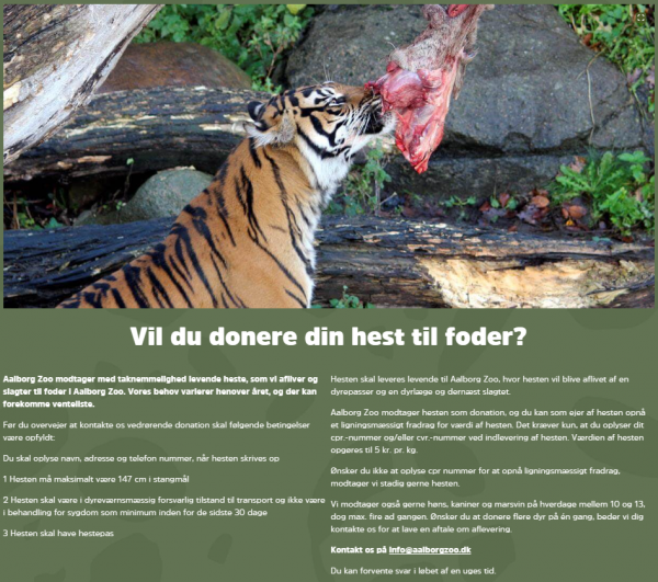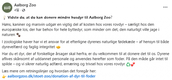 지난달 31일 덴마크 올보르의 한 동물원은 공식 SNS에 ‘반려동물을 사료로 기부해 달라’는 게시물을 올렸다. 기부 대상은 닭, 토끼, 기니피그 등 소형 동물뿐만 아니라 말까지 포함된다.