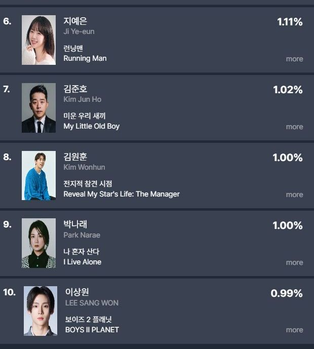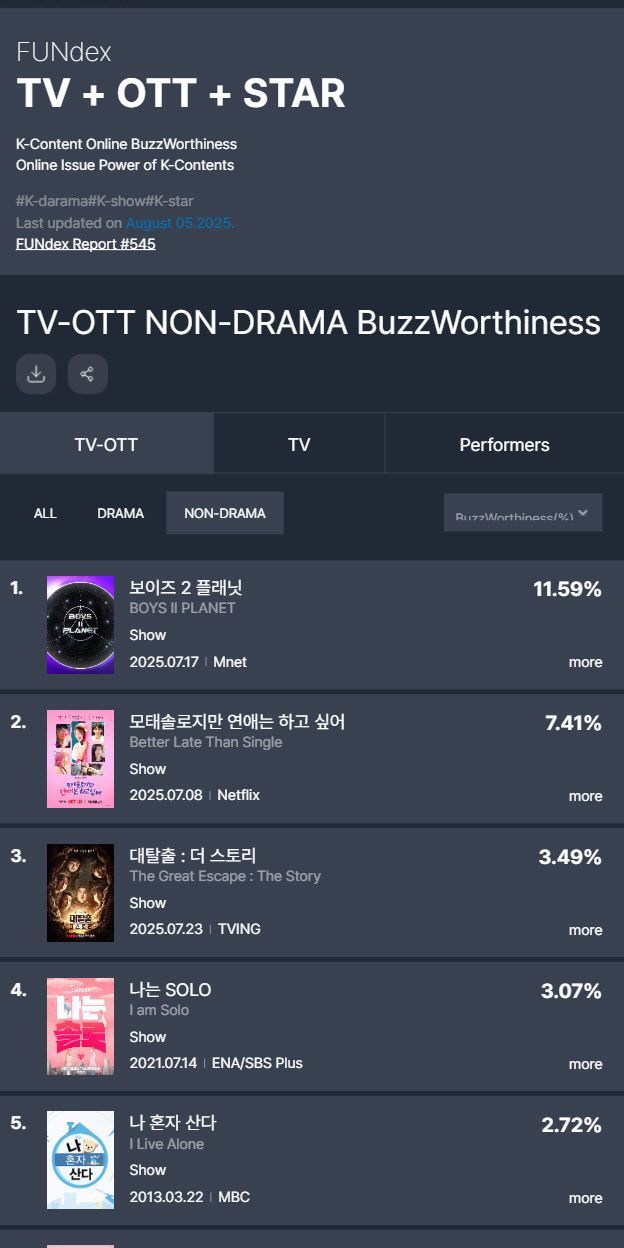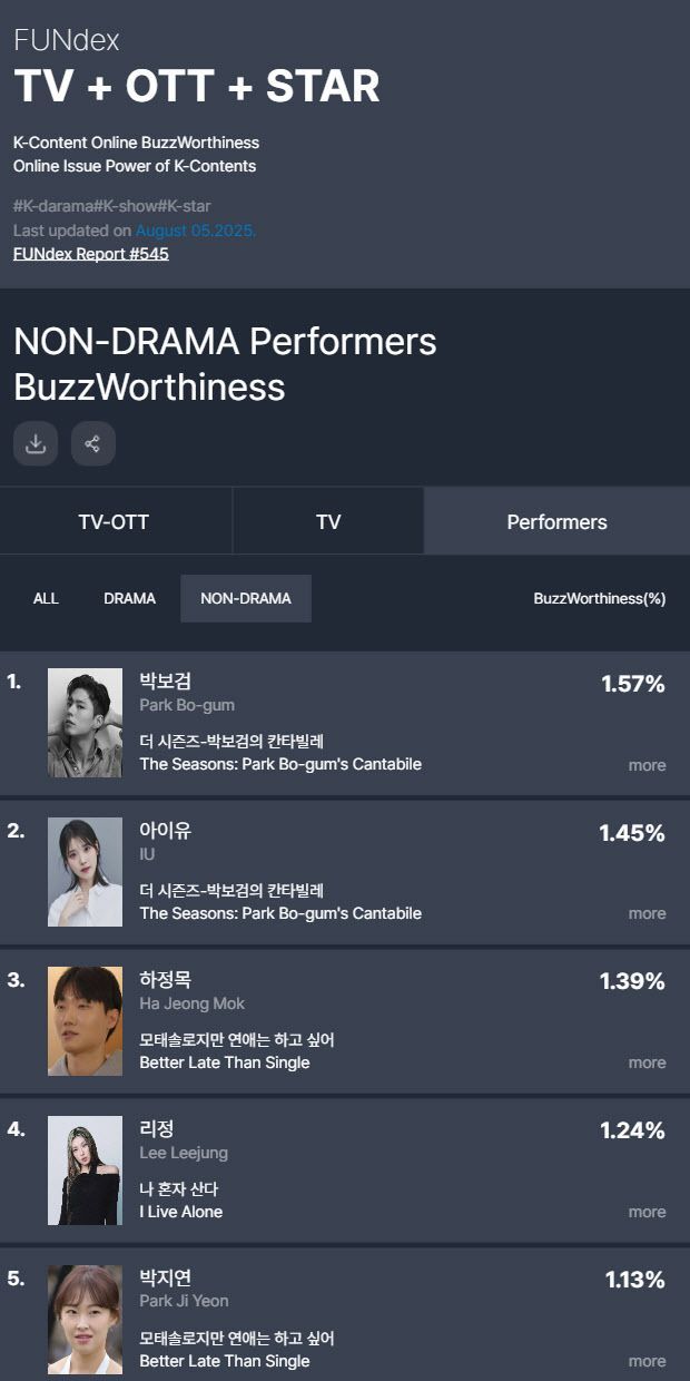 굿데이터코퍼레이션이 발표한 7월 5주차 순위는 2025년 7월 28일부터 2025년 8월 3일까지 방송 또는 공개 중이거나 예정인 TV 비드라마와 OTT 오리지널 비드라마 그리고 각 프로그램에 출연한 출연자와 게스트를 조사 대상에 포함했다.