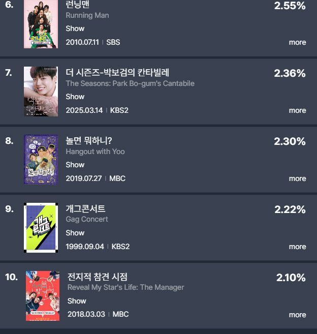 7위는 KBS2의 ‘더 시즌즈-박보검의 칸타빌레’인 것으로 나타났다. 해당 프로그램은 종영 주차에 방송 중 최고 순위를 기록했다. 8위부터 10위까지는 MBC의 ‘놀면 뭐하니?’, KBS2의 ‘개그콘서트’ 그리고 MBC의 ‘전지적 참견 시점’ 순이다.