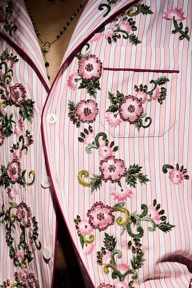 피날레 룩으로 완성한 자수 장식 파자마는 30여 벌의 퍼레이드를 펼치며 쇼의 대미를 장식했다. 여름날의 청량한 이브닝 룩을 대체할 만큼 화려하고 아름다웠다. 파삭파삭한 코튼 소재의 가벼움과 편안함, 그 위에 수놓은 크리스털과 자수 장식의 대비는 파자마 위에 꽃을 피운 듯했다. 봄과 여름 정원, 숲속에서 저마다 개성을 뽐내는 꽃처럼 새초롬한 방울꽃과 벚꽃 등 무수한 꽃이 형형색색 반짝였다. 화려한 스톤 목걸이와 겹쳐진 묵주 목걸이, 극도의 호화로움을 무심히 눌러주는 슬리퍼 슈즈의 자유분방함과 여유로움은 그 자체로 시선을 압도했다. 관객석 곳곳에서 박수와 환호가 터져 나왔다. 돌체앤가바나의 위트와 풍요 속에서 모두가 패션 판타지의 환희를 곱씹어보는 듯 즐거운 표정이었다.