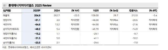 롯데에너지머티리얼즈의 2분기 실적은 매출액 2049억원, 영업적자 311억원을 기록했다.