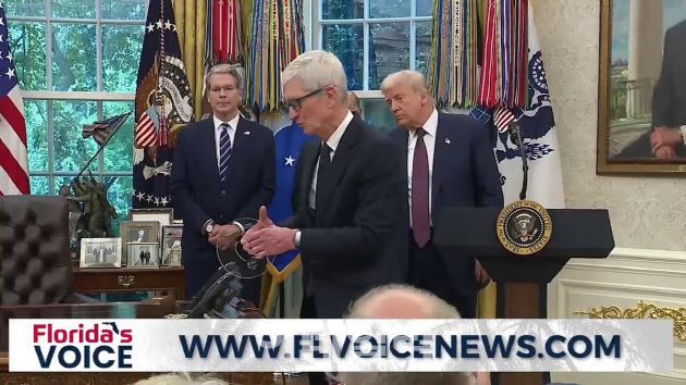 [이데일리 윤정훈 기자]트럼프 미국 대통령은 6일(현지시간) 오후 4시30분께 백악관 집무실에서 애플의 신규 대미투자 계획을 발표했다. 이 자리에 참석한 팀 쿡 애플 최고경영자(CEO)는 긴장한 듯 모습으로 트럼프 대통령에게 줄 선물을 공개했다.