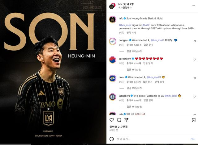 '월드 클래스' 축구 스타 손흥민(33)이 미국프로축구(MLS) 로스앤젤레스(LA) FC 입단을 발표하자, 지역 다른 종목 빅클럽들도 반겼다.