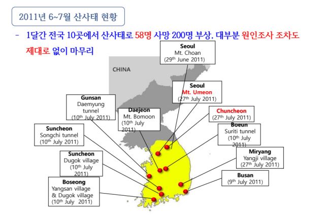 이 교수는 "많은 산사태 피해 지역이 산사태 취약 지역(산림청 산사태 위험지도)에 나와 있지 않다. 위험 지도가 다 틀렸다"며 "인명 피해도 막지 못하는 연구를 왜 해야 하느냐"고 강도 높게 비판했다.