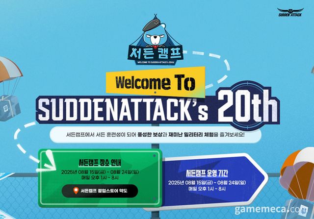 서비스 20주년 당일인 23일에는 팝업스토어 현장에서 생일파티 쇼케이스를 연다. 오후 6시 30분부터 김태현 디렉터가 등장해 생일 기념 행사와 업데이트 계획을 발표한다. 앞서 오후 2시부터 오프닝 토크, 20주년 기념 서든라이브 방송, 올스타전, 스페셜 게스트가 출연하는 서든캠프 체험 영상 상영, 퀴즈쇼를 진행한다.