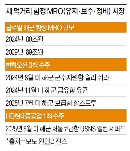 MRO 사업은 규모가 작지 않지만 그동안 소외됐던 시장이다. 한국은 세계 조선업 1위를 자랑하지만 파이가 작았던 MRO 시장에 큰 관심을 두지 않았다. 시장조사기관인 모도 인텔리전스에 따르면 글로벌 해군 함정 MRO 시장 규모는 2024년 80조원에 달했다. 2029년까지 89조원까지 성장할 전망이다.
