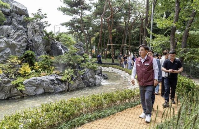 | ▲ 박강수 마포구청장이 댕댕이 폭포 조성 현장을 둘러보고 있다. |