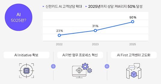 13일 카드업계에 따르면, 신한카드는 연내 모든 영역에 AI를 접목시키는 'AI 5025 프로젝트'를 추진하고 있다. AI 5025는 올해까지 대고객 상담 커버리지의 50%를 AI로 대체하는 것을 비롯해 상담 프로세스 전반을 개선하기 위한 프로젝트다.
