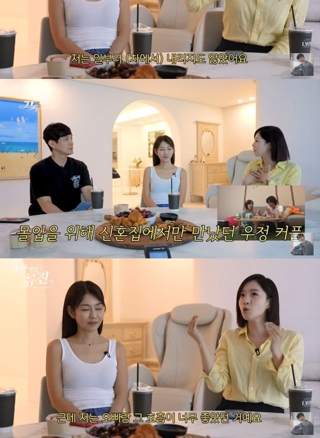 이에 박탐희는 "살짝 마음이 생긴다더라"며 "드러나지 않을 뿐이지 정말 썸 타다가 끝난 사람도 있지 않을까"라고 추측했고, 함은정은 "저는 일부러 (차에서) 내리지도 않았다. 마이크 찰 때 만나면 너무 가상 같아서"라며 몰입을 위해 신혼집 안에서 만났음을 고백했다.