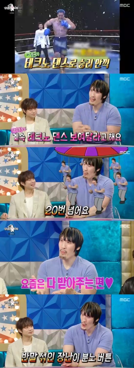 또 최홍만은 격투기 선수로 전성기를 누리던 당시 큰 화제였던 '테크노 댄스 세리머니'를 언급하면서 "제가 지금 사는 지역에 10대 학생들이 많은데 테크노 댄스를 춰달라고 그렇게 부탁을 많이 한다. 그럼 '봐라 봐라'하면서 춰준다. 많이 출 때는 20번 정도 춘다"고 말해 큰 웃음을 줬다.