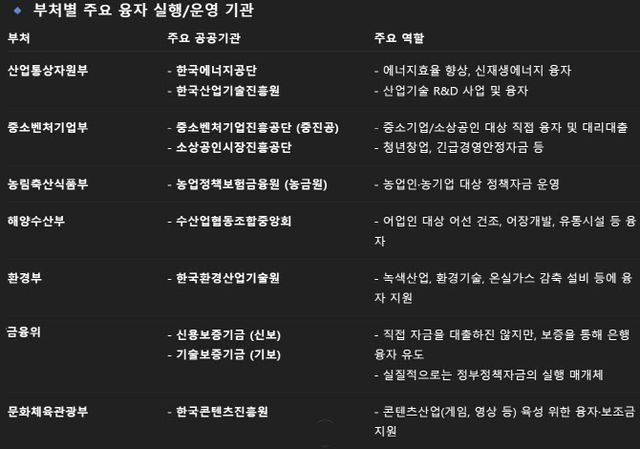 관계자들의 입장을 종합해보면 현재 대통령실은 관계부처와 함께 정책금융기관 전반을 테이블에 올려놓고 보고 있다. 주요 정책금융기관은 금융위원회 유관기관인 신용보증기금(신보)·기술보증기금(기보), 중소벤처기업부 유관기관인 중소벤처기업진흥공단(중진공)·소상공인시장진흥공단, 산업통상자원부 유관기관인 한국에너지공단·한국산업기술진흥원, 농림축산식품부 유관기관인 농업정책보험금융원(농금원), 해양수산부 유관기관인 수산업협동조합중앙회(수협), 환경부 유관기관인 한국환경산업기술원, 문화체육관광부 유관기관인 한국콘텐츠진흥원 등이다.