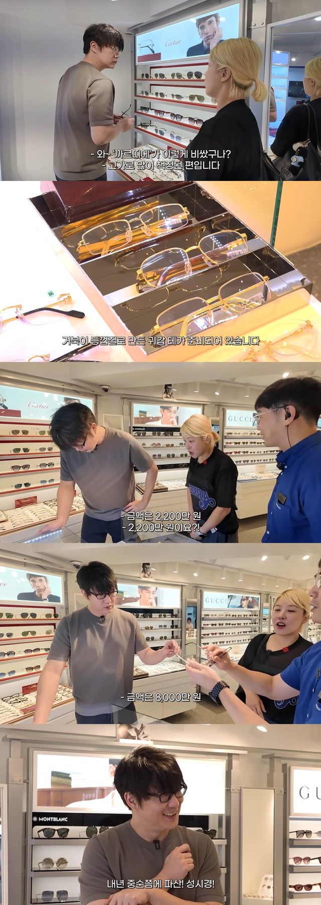 이를 본 직원은 "거기서 놀라시면 안 된다. 바로 뒤로 돌아보시면 여기는 금테들과 안경테 소재 중 가장 비싼 거북이 등껍질로 만든 귀갑 테가 준비되어 있다. 금액은 2,200만원이다"라고 설명했다.