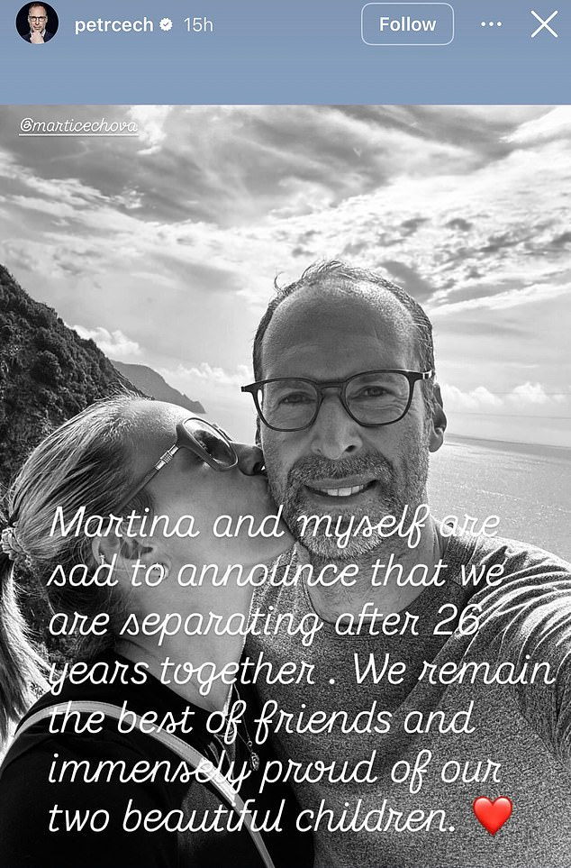 체흐는 "마르티나와 난 26년을 함께한 끝에 헤어지게 됐다는 슬픈 소식을 전한다"글과 함께 흑백 사진을 올렸다. 사진은 마르티나가 체흐의 뺨에 키스하고 있는 모습이 담겼다.