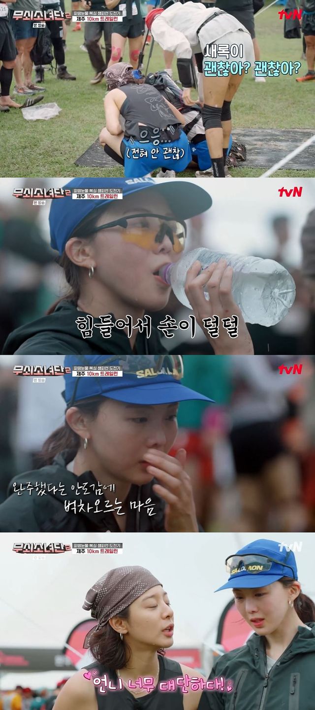 또 이날 첫 트레일런에 참가한 금새록은 유이, 박주현의 뒤를 이어 완주에 성공했다. 2시간 17분 05초에 트레일런 완주에 성공한 금새록. 하지만 결승 통과하자마자 털썩 주저앉았다. 금새록과 함께 달린 김동현은 "(새록이가) 이 악물고 했다"라며 칭찬했다.