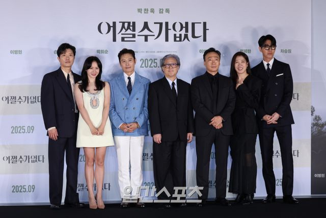 배우 박희순, 손예진 이병헌, 박찬욱 감독, 이성민, 염혜란, 차승원이 19일 오전 서울 용산구 CGV용산아이파크몰에서 열린 영화 '어쩔수가없다' 제작보고회에 참석해 포토타임을 갖고 있다. '어쩔 수가 없다'는 모든 것이 만족스러웠던 회사원 만수가 갑작스러운 해고 이후 가족과 집을 지키기 위해 재취업 전쟁에 뛰어드는 이야기를 그린다. 내달 개봉 예정. 서병수 기자 qudtn@edaily.co.kr /2025.08.19/
