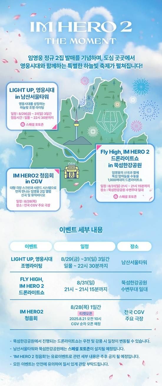 31일에는 뚝섬한강공원 수변무대 일대에서 임영웅의 신곡과 함께 뚝섬 밤하늘을 수놓을 1000여대의 드론라이트쇼가 개최되고, 스페셜 포토존도 이어진다.